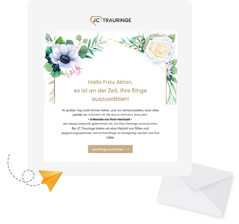 Aufbau automatisierter Customer Journeys mit personalisierten Touchpoints. Ring-Reminder-Kampagne mit Abfrage des Hochzeitsdatums und mehreren Follow-up-Mails zu wichtigen Meilensteinen.